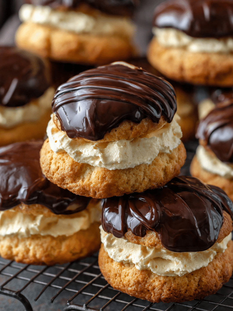 Boston Cream Pie Cookies use soft cookies instead of cake layers. They still include the same elements vanilla base, cream filling, and chocolate topping but in a handheld form.