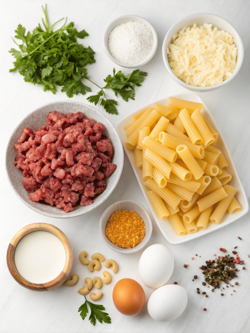 Cheesy rigatoni beef carbonara recipe uses simple, everyday ingredients that create a rich, creamy result. You only need pasta, beef, eggs, cheese, and a few seasonings. Each ingredient plays a key role in building flavor and texture.